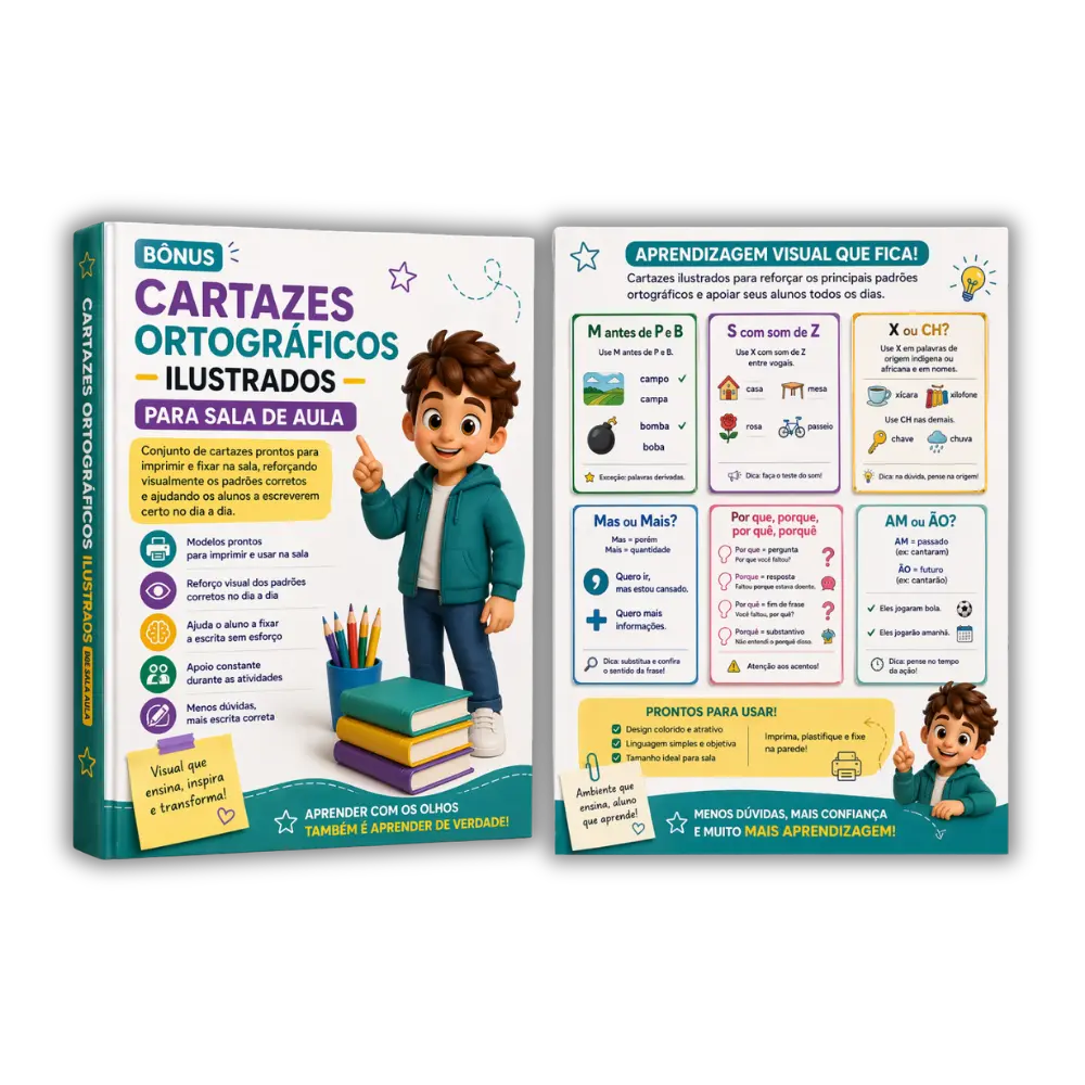 Conjunto de cartazes prontos para imprimir e fixar na sala, reforçando visualmente os padrões corretos e ajudando os alunos a escreverem certo no dia a dia.